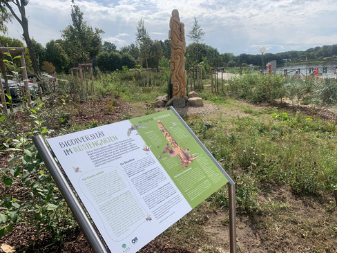 Um die verschiedenen Besucher*innen des Küstengartens zum Verweilen, Entspannen, Beobachten und Lernen einzuladen, wurden außerdem Sitzbänke aufgestellt und vier Informationstafeln installiert. Diese enthalten detaillierte Infos sowohl zum Küstengarten selbst, als auch zum Thema Biodiversität und der Geschichte Heikendorfs als Standort am und mit dem Wasser. Um hier auch Kinder und blinde oder sehbehinderte Menschen anzusprechen, wurde zum einen eine bronzene Relieftafel installiert und zum anderen auf eine kindgerechte Sprache und Gestaltung geachtet (z.B. durch den Abschnitt Für Kinder erklärt auf der Tafel "Biodiversität im Küstengarten" und die Verwendung vieler Bilder ).