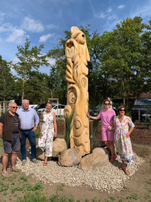 Ein besonderer Hingucker im Küstengarten ist neben der Herstellung von Dünenstrukturen auch die sogenannte Biodiversitätsskulptur, welche durch die Holzkünstlerin Hannah Arneke in 180 Stunden Handarbeit aus einem Kastanienstamm geschaffen wurde. Die Kastanie fiel im Oktober 2023 im Heikendorfer Wald um und bekam so als Kunstwerk ihr zweites Leben. Das Besondere: Die Schnitzereien dienen durch die Themen Wasser, Natur und Küste nicht nur der visuellen Ästhetik, sondern bieten durch gut durchdachte Details gleichzeitig Lebensräume für verschiedene Tierarten.