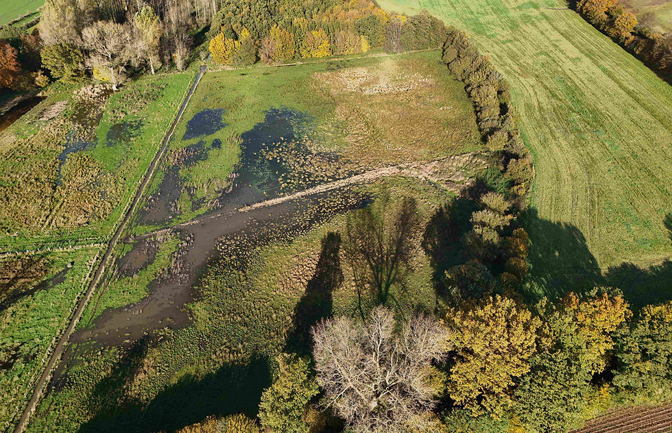 Auf landwirtschaftlichen Flächen können kleine Wasserrückhaltebereiche oder feuchte Senken entlang von Gräben und Gehölzstreifen, sowie natürliche Kleingewässer wie Tümpel, Teiche oder naturnaher Seen angelegt werden.